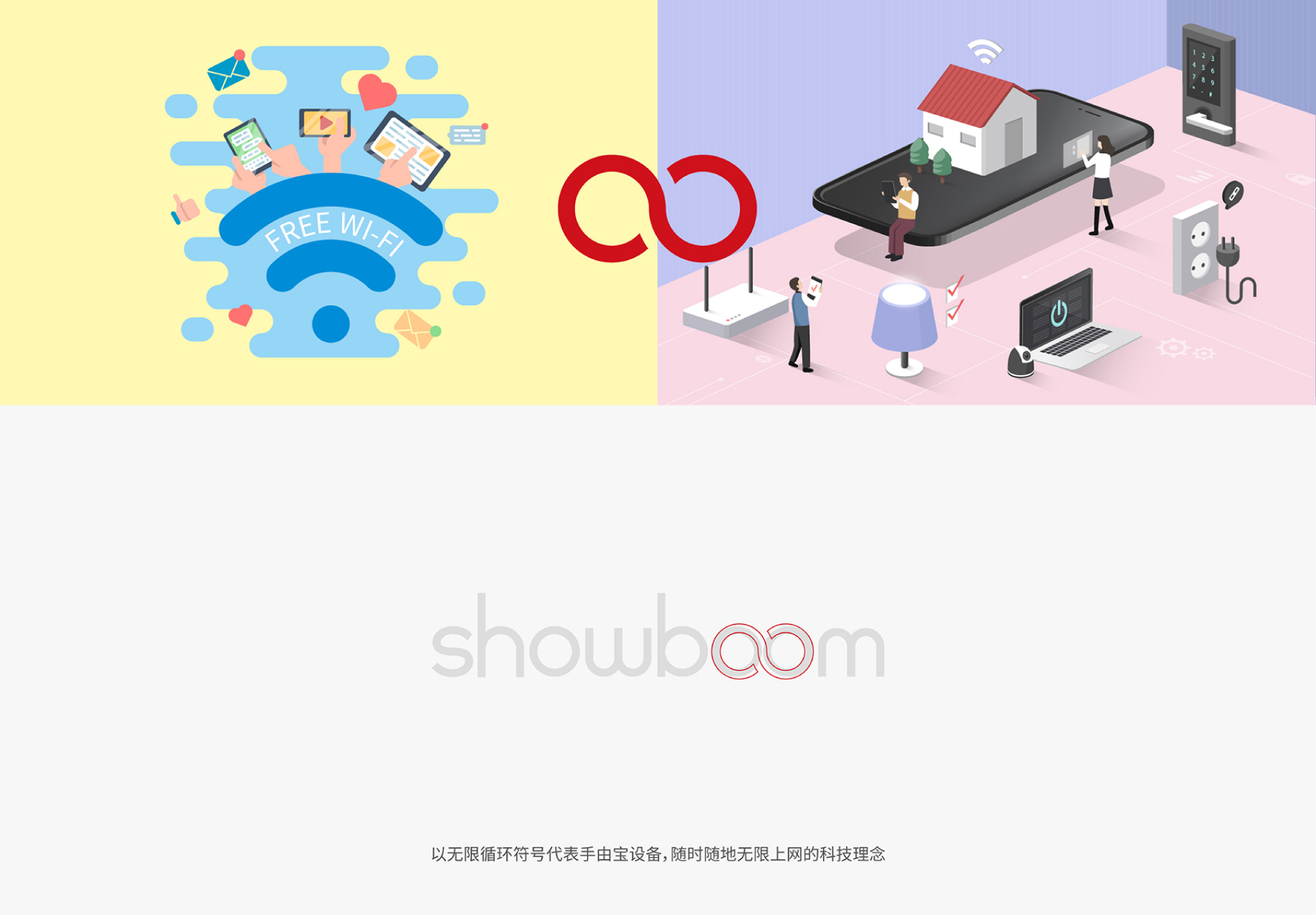 设计呈现:在进行logo设计中,我们聚焦showboom秀豹科技为受众提供“无限”流量的服务核心,以“无限符号”为品牌核心与识别,将其巧妙融入进企业品牌“showboom”之中,代表着品牌不仅为受众提供无限流量的产品理想,也代表了品牌在探索科技改变人类生活的道路上永不停歇的事业理想。