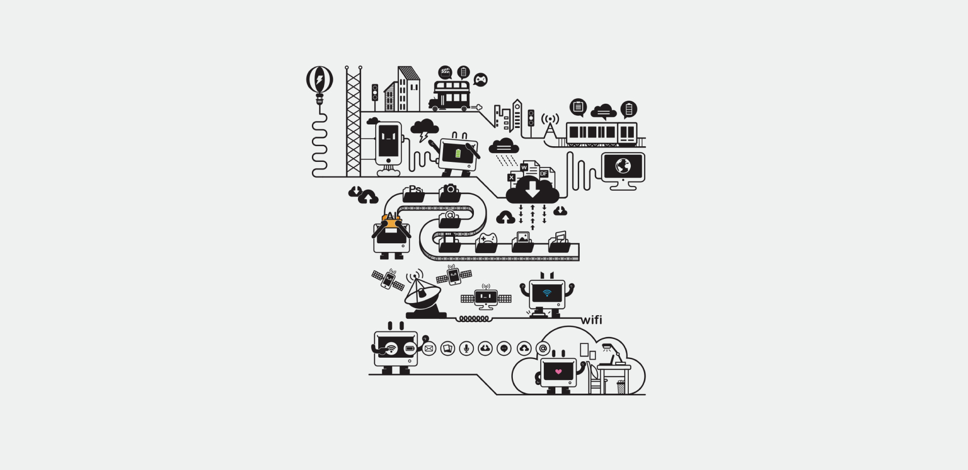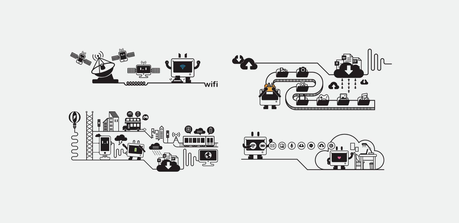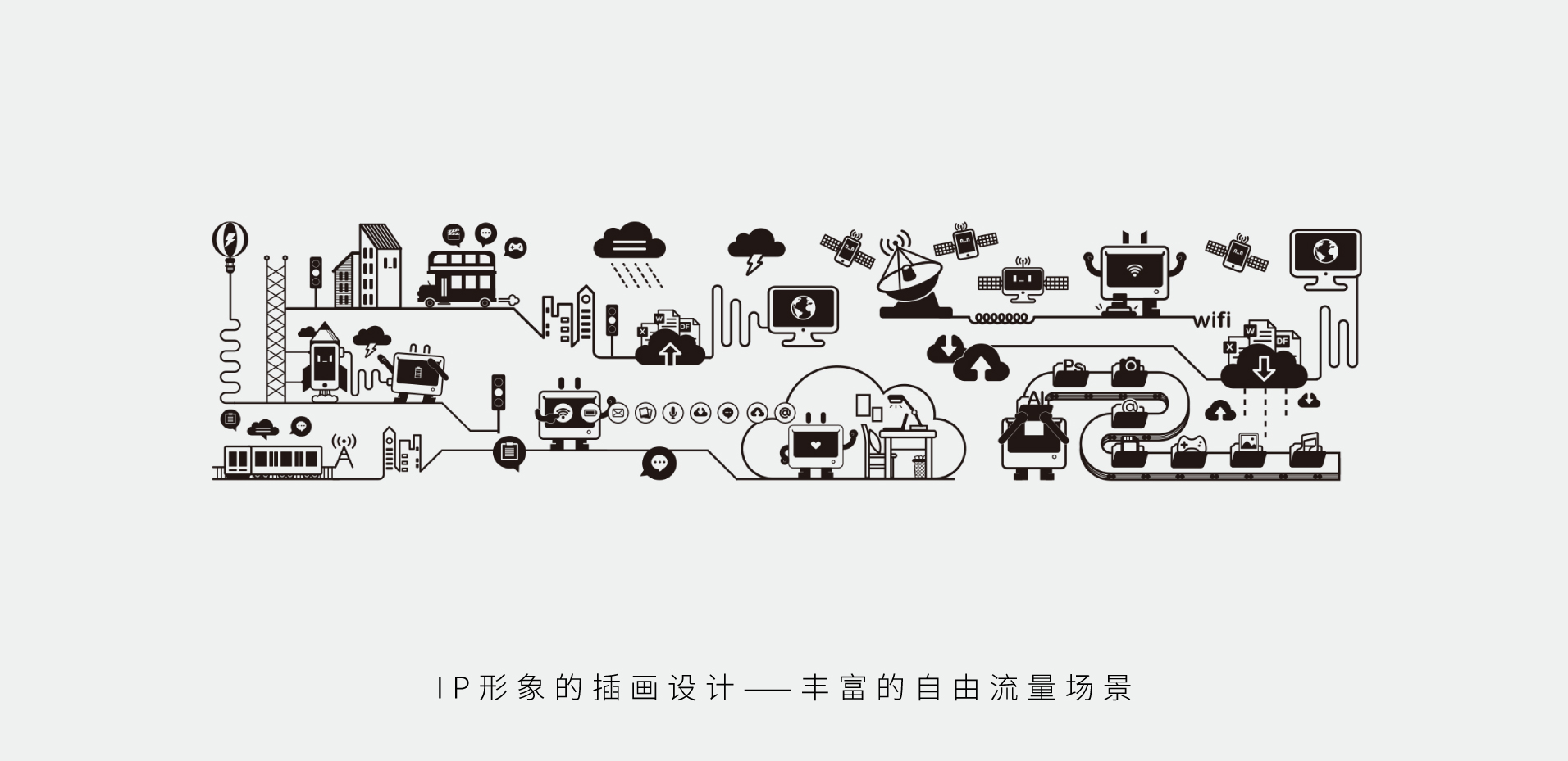 包装设计中,我们围绕着“将免费上网进行到底”的提出,设计以独特的IP形象,将其拟人为不同的上网场景,充满丰富的趣味性与代入感。