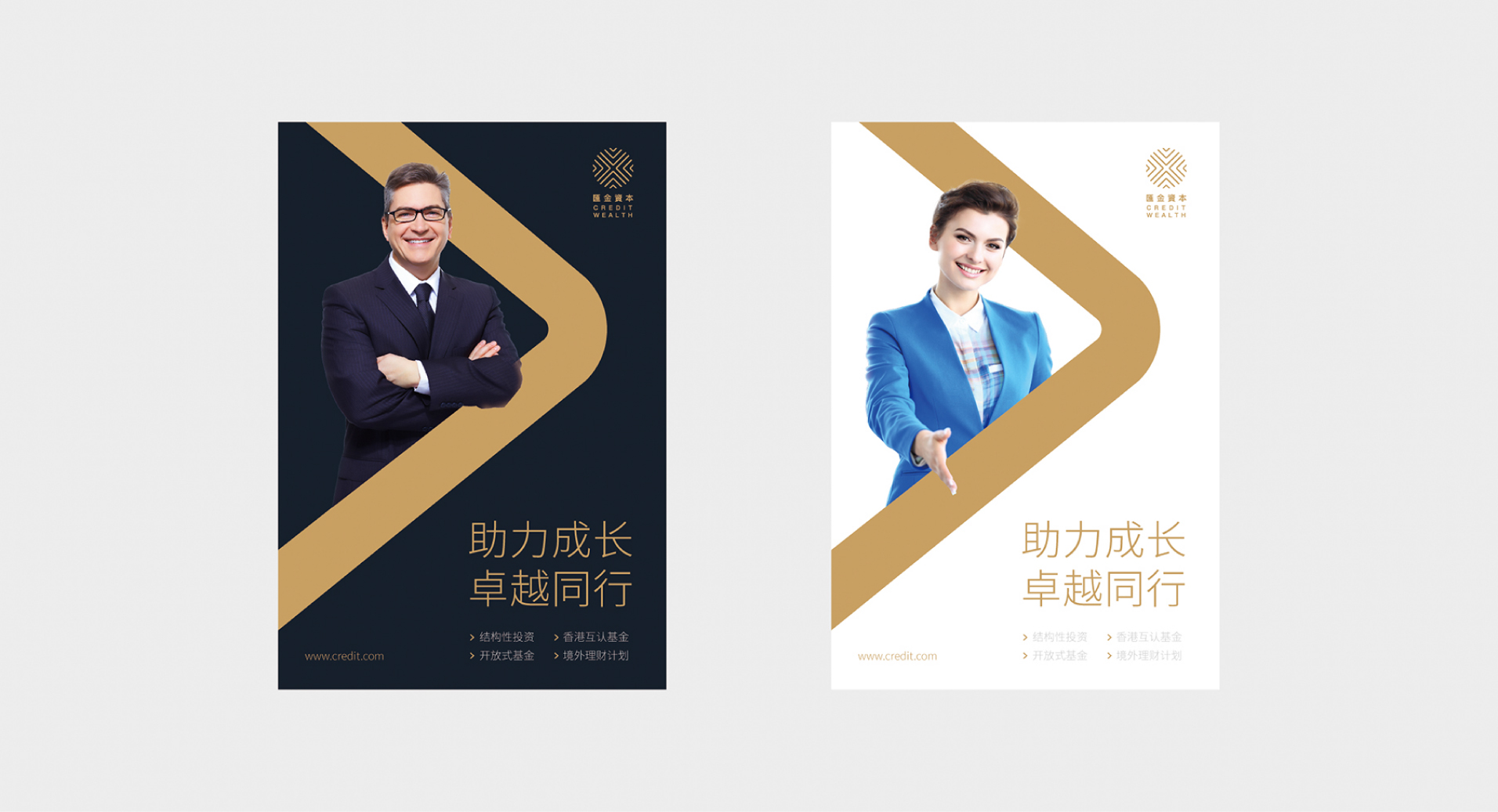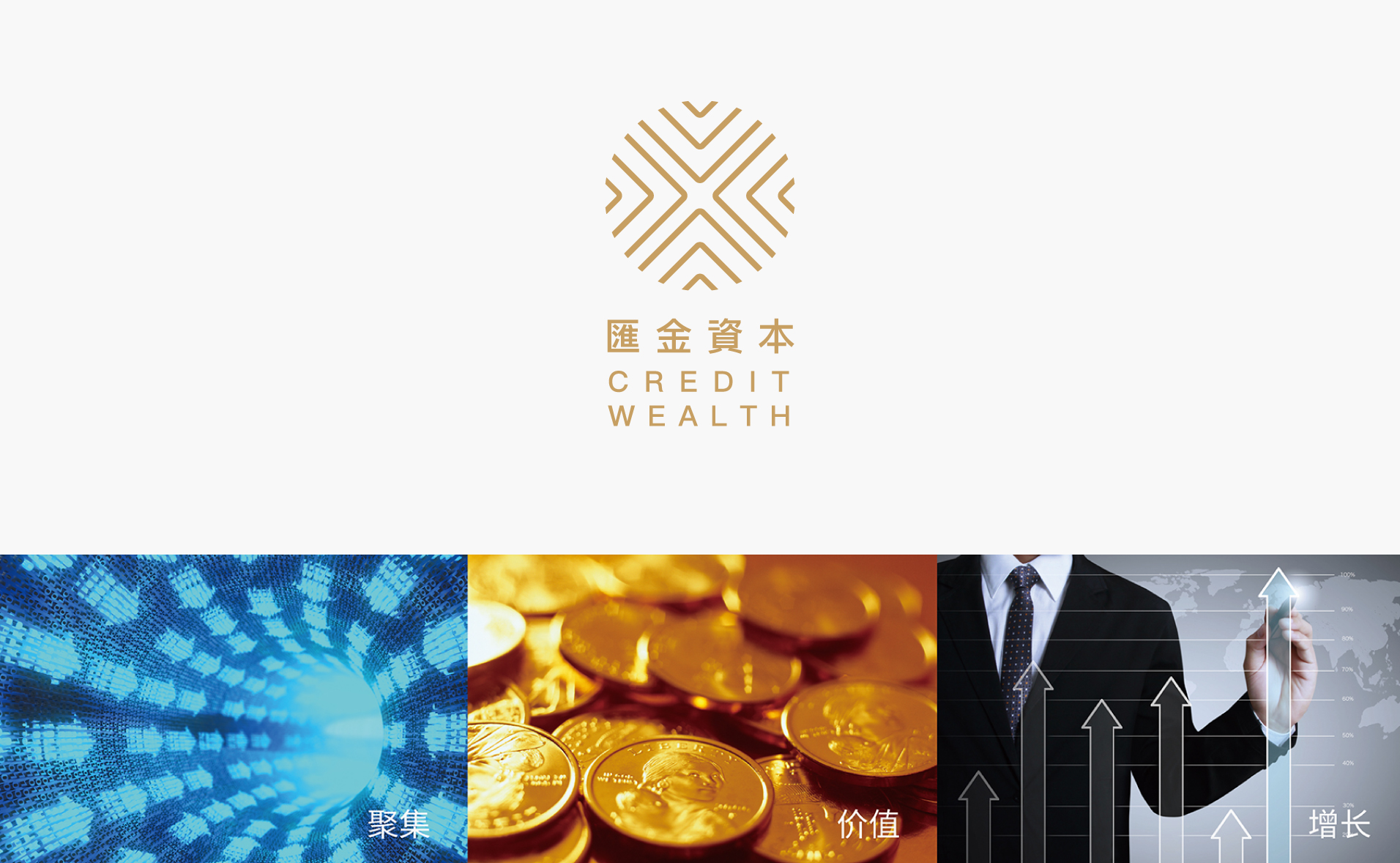 设计呈现:将代表进取与增长的箭头图形汇聚为一个抽象的铜钱感——向内聚集的箭头,代表着资本与好的项目的吸引与聚集,而图形中的负形“X”代表着为项目提供良好的资源导入代表了未来无限的可能。同时箭头延展应用在VI系统、海报等视觉中,形成了系统、清晰、有力的品牌视觉资产。